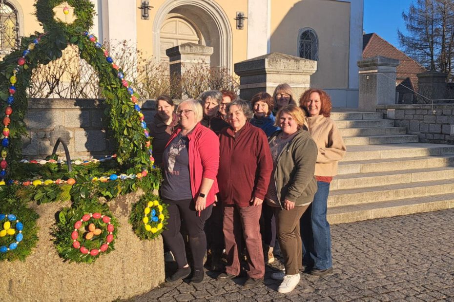 Gartenbauverein und Frauenbund haben gemeinsame Sache gemacht: Fleißige Vereinsmitglieder beider Vereine haben einen Osterbrunnen gestaltet und damit den Kirchplatz verschönert.